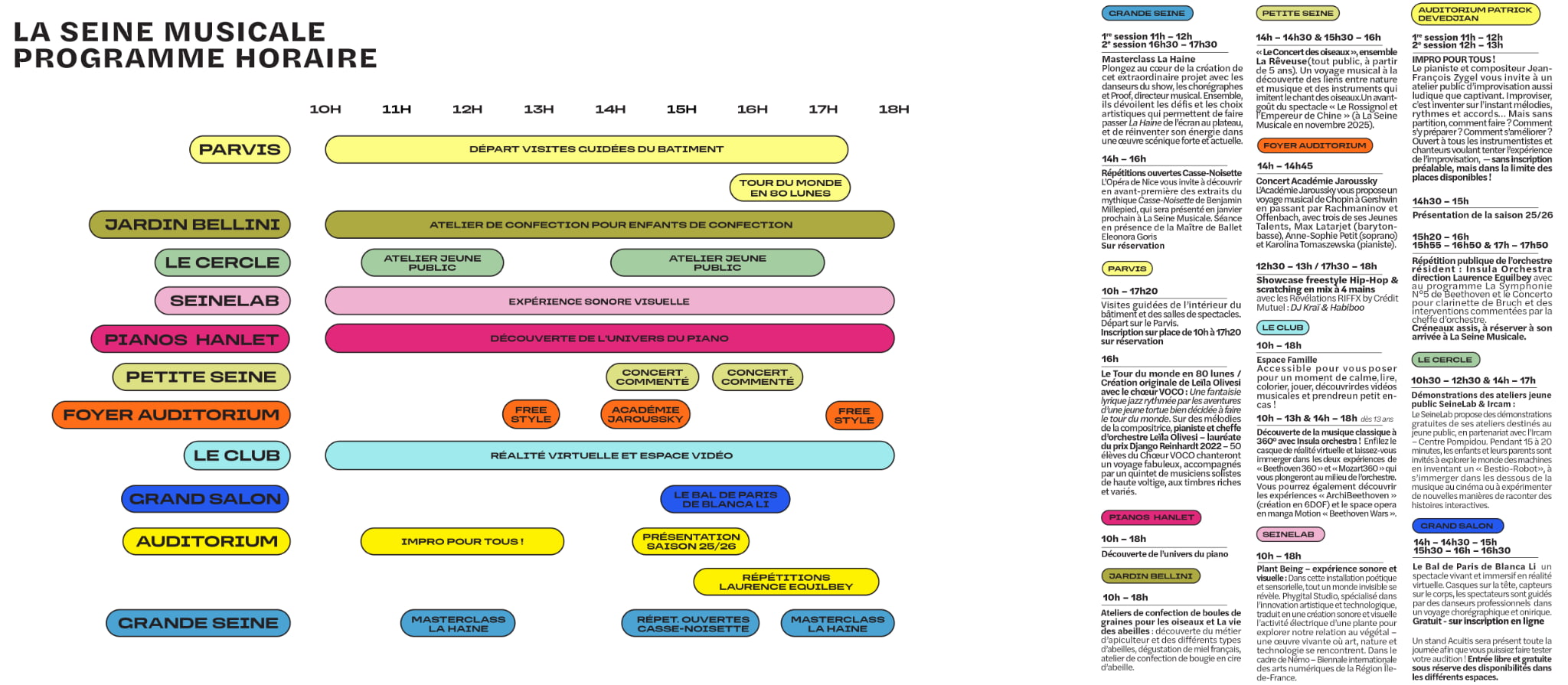 La Seine Musicale ouvre ses portes le dimanche 21 septembre 2025 de 10h à 18h, pour une journée conviviale gratuite, autour de visites guidées du bâtiment, d’œuvres d’art contemporain, de concerts, de répétitions ouvertes au public, d’animations autour des instruments d’époque ou de la réalité virtuelle avec l’orchestre résident Insula orchestra, de la présentation de la programmation de saison 2025-2026 par les différents acteurs de La Seine Musicale, de la découverte du SeineLab et de ses ateliers jeune public en partenariat avec l’Ircam… et bien d’autres surprises !