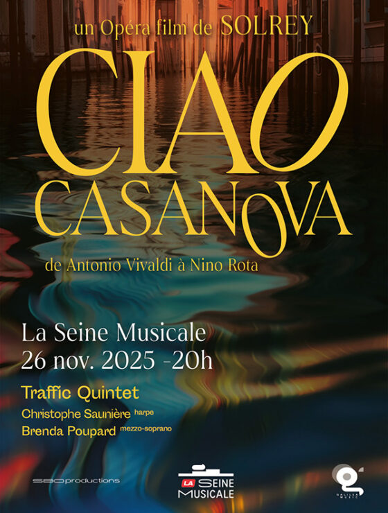 Autour d’un scénario musical, associant Venise et la figure du séducteur dans l’histoire du Cinema, Solrey nous révèle au fil des eaux troubles vénitiennes un répertoire d’une richesse exceptionnelle et ranime à l’écran sur le ton des comédies à l’Italienne ces figures et postures d’un temps révolu. « Pulcinella » de Stravinsky ouvrira le bal des fastes vénitiens suivi des œuvres de Nino Rota, Alexandre Desplat, Mozart, John Williams, mêlant modernité et classicisme. Un spectacle inspirant qui donne à entendre la force émotionnelle du couple musique/image.