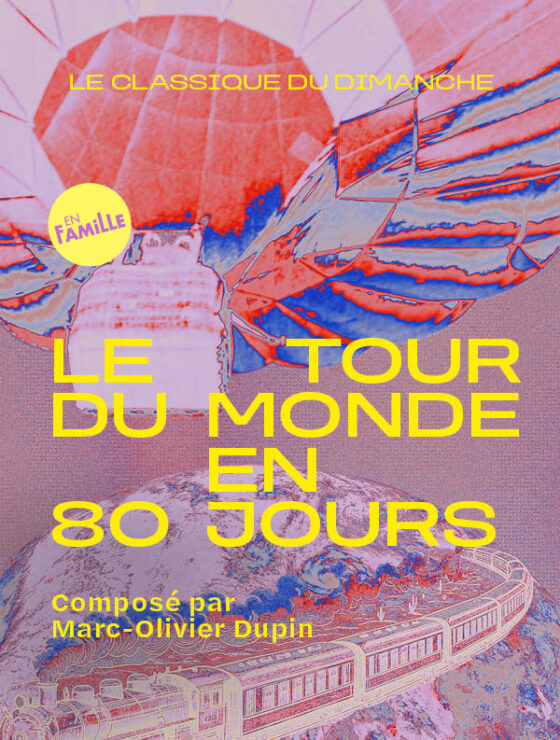 Préparez-vous à embarquer pour un tour du monde en musique et en images ! Le compositeur Marc-Olivier Dupin a transformé le célèbre roman de Jules Verne en un spectacle total où la musique évoque instantanément les étapes du voyage, suggérant par des couleurs et des rythmes variés une atmosphère singulière et dépaysante. La musique, tantôt mystérieuse, tantôt endiablée, nous fait vivre chaque étape de leur chevauchée fantastique à travers les continents de Phileas Fogg, un gentleman anglais, et de Passepartout, son fidèle serviteur.