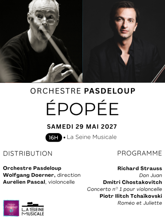 L’Orchestre Pasdeloup propose un programme fougueux et brillant. Le concert s’ouvre avec Don Juan de Richard Strauss, puis Aurélien Pascal, invité pour la première fois par l’Orchestre Pasdeloup, interprète le magnifique et héroïque Concerto n° 1 pour violoncelle de D. Chostakovitch. Wolfgang Doerner, ami de longue date de l’orchestre, dirige ensuite l’ouverture de Roméo et Juliette de P. I. Tchaïkovski.