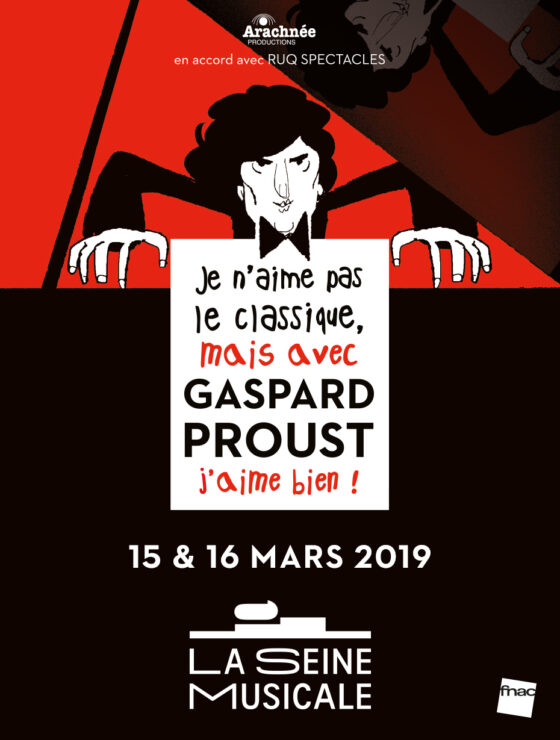 Gaspard Proust entouré d’un groupe de musiciens classiques de renom (piano, violons, violoncelle, alto, flûte et clarinette) jouera les prolongations dans le splendide écrin de l’Auditorium de la Seine Musicale le vendredi 15 et samedi 16 mars 2019 pour deux représentations exceptionnelles. Le public assistera ainsi à un magnifique concert et plus encore à la rencontre du stand-up et de la musique classique. Grâce à lui, grâce à eux, nul doute que même si on n’aime pas le classique, ça, on adorera !