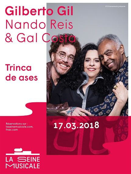 La légende de la musique populaire brésilienne se produira sur scène aux côtés de deux grandes voix contemporaines du pays de la samba : Nando Reis et Gal Costa. Dans le cadre de leur tournée mondiale «Trinca de Ases» (Brelan d’as), ces trois mousquetaires-poètes nous convient à une soirée où s’enchevêtrent voix, guitares et percussions pour une musique festive qui distille un profond sentiment de bonheur. Ils seront accompagnés par le bassiste Magno Brito(du groupe Sinara) et le percussionniste Kainan do Jejê.
