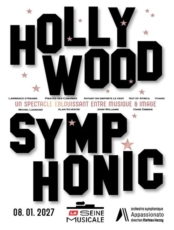 Hollywood Symphonic est un concert exceptionnel où l’Orchestre Symphonique Appassionato, dirigé par le truculent Mathieu Herzog, rend hommage aux plus grands compositeurs du 7ᵉ Art. Des chefs-d’œuvre de Michel Legrand à ceux de Hans Zimmer, John Williams ou Max Steiner, ce spectacle vous transporte dans un voyage symphonique à travers les époques et les émotions. Sur scène, la magie de la musique de film se marie aux images des films projetées, pour revivre les scènes cultes de Yentl, Out of Africa, Autant en emporte le vent et bien d’autres encore. Un rendez-vous unique où les images et les harmonies fusionnent pour sublimer le cinéma !