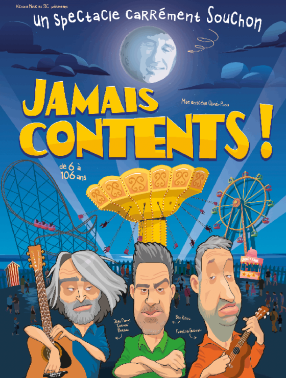 Après deux ans de tournée et de représentation de « Gainsbourg For Kids », Ben Ricour, Jean-Pierre « Cheveu » Bottiau et François Guernier reviennent avec un tout nouveau spectacle « Jamais Contents ! » autour du répertoire du grand Alain Souchon.
