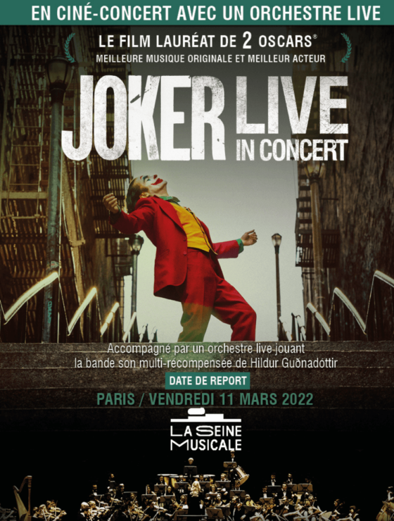 En raison de la crise sanitaire et des restrictions toujours en cours sur les événements publics, la tournée du ciné-concert Joker prévue le 14 avril 2021 à La Seine Musicale est reportée au vendredi 11 mars 2022.