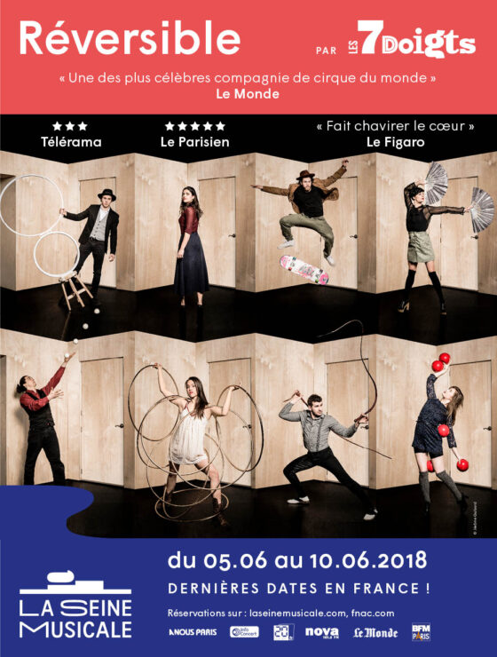 La célèbre troupe québécoise des 7 Doigts de la Main terminera en beauté la tournée française de son spectacle « Réversible » sur la Grande Seine de la Seine Musicale, transformée pour l’occasion en un théâtre de 2 000 places. Une création intense aux prouesses circassiennes rarement vues, mêlant avec poésie la danse, le théâtre et la musique. A voir absolument !