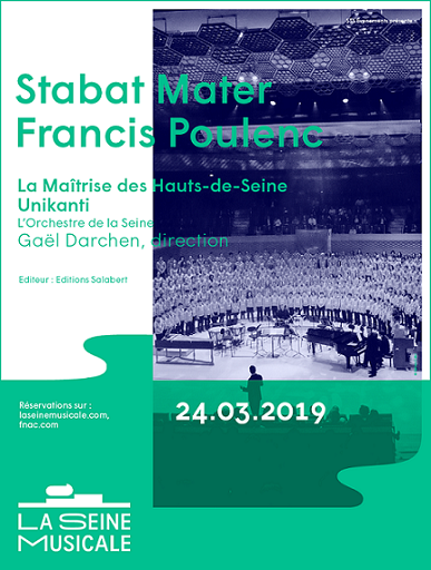 Œuvre composée en seulement deux mois d’été et dont le compositeur fut le premier étonné du jaillissement, le Stabat mater de Francis Poulenc pour grand orchestre, chœur mixte et soprano solo, est écrit à la mémoire d’un être cher. C’est en effet pour l’artiste peintre et décorateur Christian Bérard, disparu subitement en 1950, que Poulenc, soucieux d’écrire une œuvre religieuse « sans désespoir » et, de nouveau inspiré par Notre-Dame de Rocamadour, choisit les versets de la séquence qui décrit la compassion de la vierge Marie aux douleurs de son fils. Faisant tenir ensemble dignité et douceur, solennité et mise à distance presque ironique, appuis terrestres et rêves immatériels, Poulenc se livre dans son anticonformisme et sa recherche d’authenticité à une œuvre chorale terriblement visuelle et architecturale. Soutenu par l’Orchestre de la Seine en grand effectif, et les 300 chanteurs émanant de la Maîtrise des Hauts-de-Seine aiguisée par l’influx électrique et le cristal de ses voix d’enfants, l’imaginaire du spectateur est appelé à s’engager, au cadran des 12 mouvements de ce monument de la musique française, dans une course initiatique.