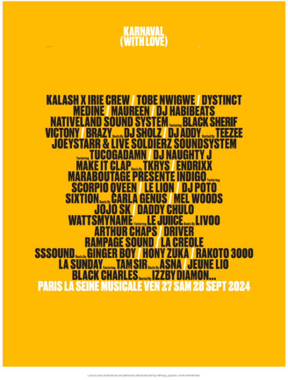Karnaval (« With Love ») incarne le vibrant esprit de rébellion inhérent à l’histoire des carnavals à travers le monde. Né dans les années 1800 pour commémorer les rébellions qui ont aboli l’esclavage, cet événement rend hommage à l’héritage profond de ces célébrations. Au cœur de Karnaval (With Love), nous nous efforçons de mélanger la richesse historique du théâtre de rue, que nous considérons comme l’une des formes d’art les plus élevées, avec les racines profondes de la culture Sound System, en réunissant les meilleurs collectifs festifs de Paris et du monde entier. « (With Love)comme ce qui nous anime ; naviguer dans les moments difficiles et partager notre histoire pour embrasser notre joyeuse rébellion, nous faisons tout cela (With Love) ».