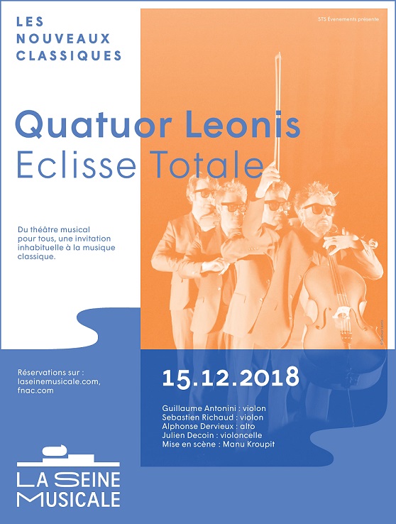 Formés dans les plus prestigieux conservatoires de France, les quatre musiciens du quatuor Leonis ont écumé pendant plus de dix ans les scènes classiques. Ils vivent désormais sur scène une véritable éclipse musicale, jouant et dansant à la manière de funambules sur leurs cordes, dans un univers burlesque et poétique…